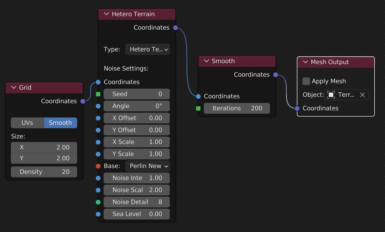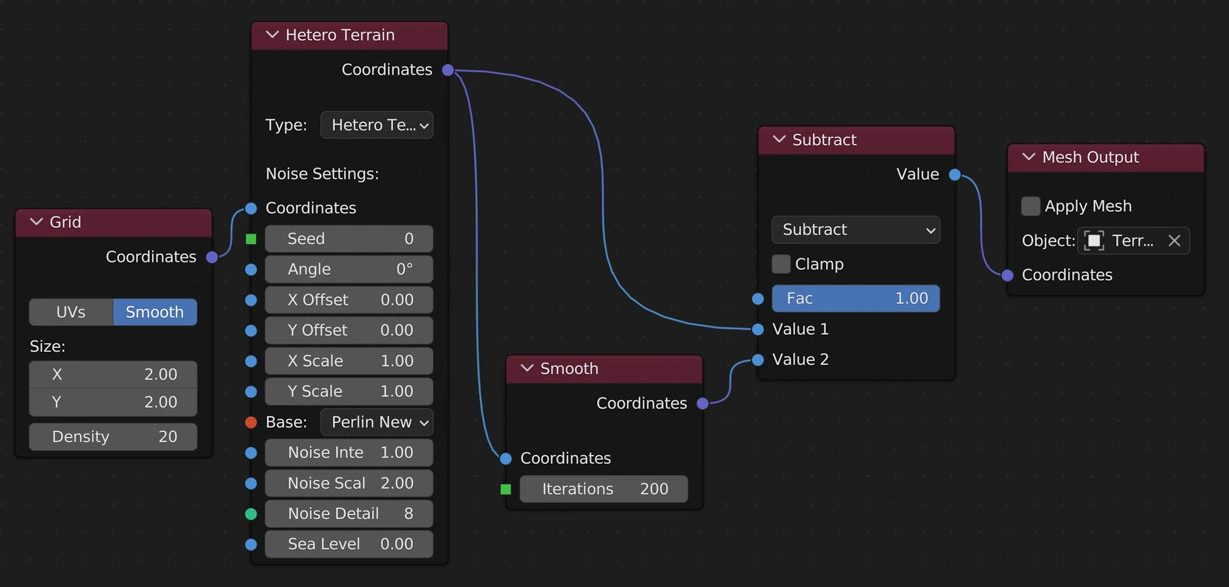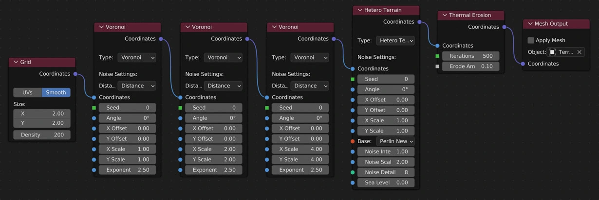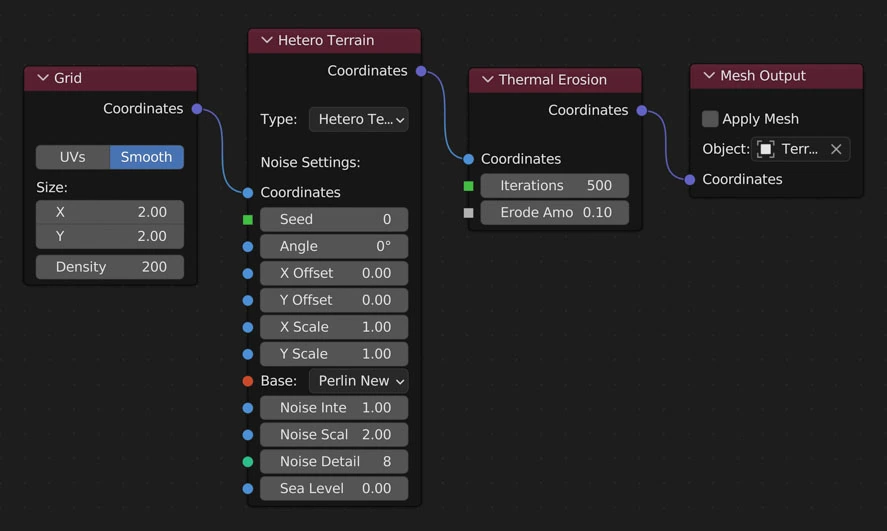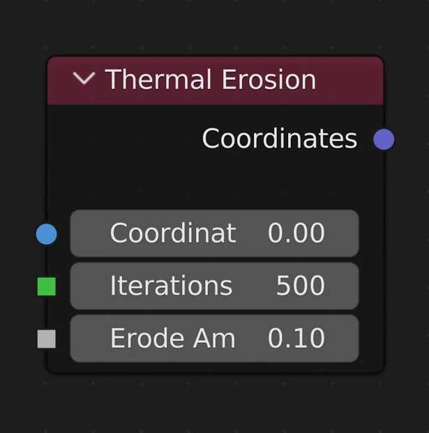 Simulates erosion of ice-bearing permafrost by the thermal action of moving water. Basically, this node goes through the surrounding vertices of each vertex and moves sediment from the current vertex to the lowest vertex.